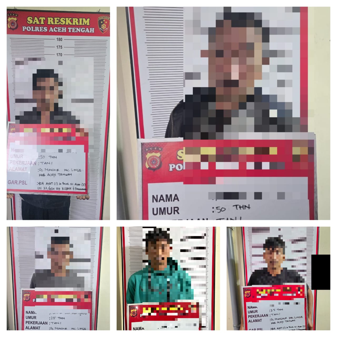 Adapun kelima terduga pelaku yakni berinisial S (40), Petani, Warga Pancar Jelobok Kecamatan Pintu Rime Gayo Kabupaten Bener Meriah, dan M (50), Perdagangan, Warga Desa Blang Gele Kec.Bebesen Kab.Aceh Tengah.