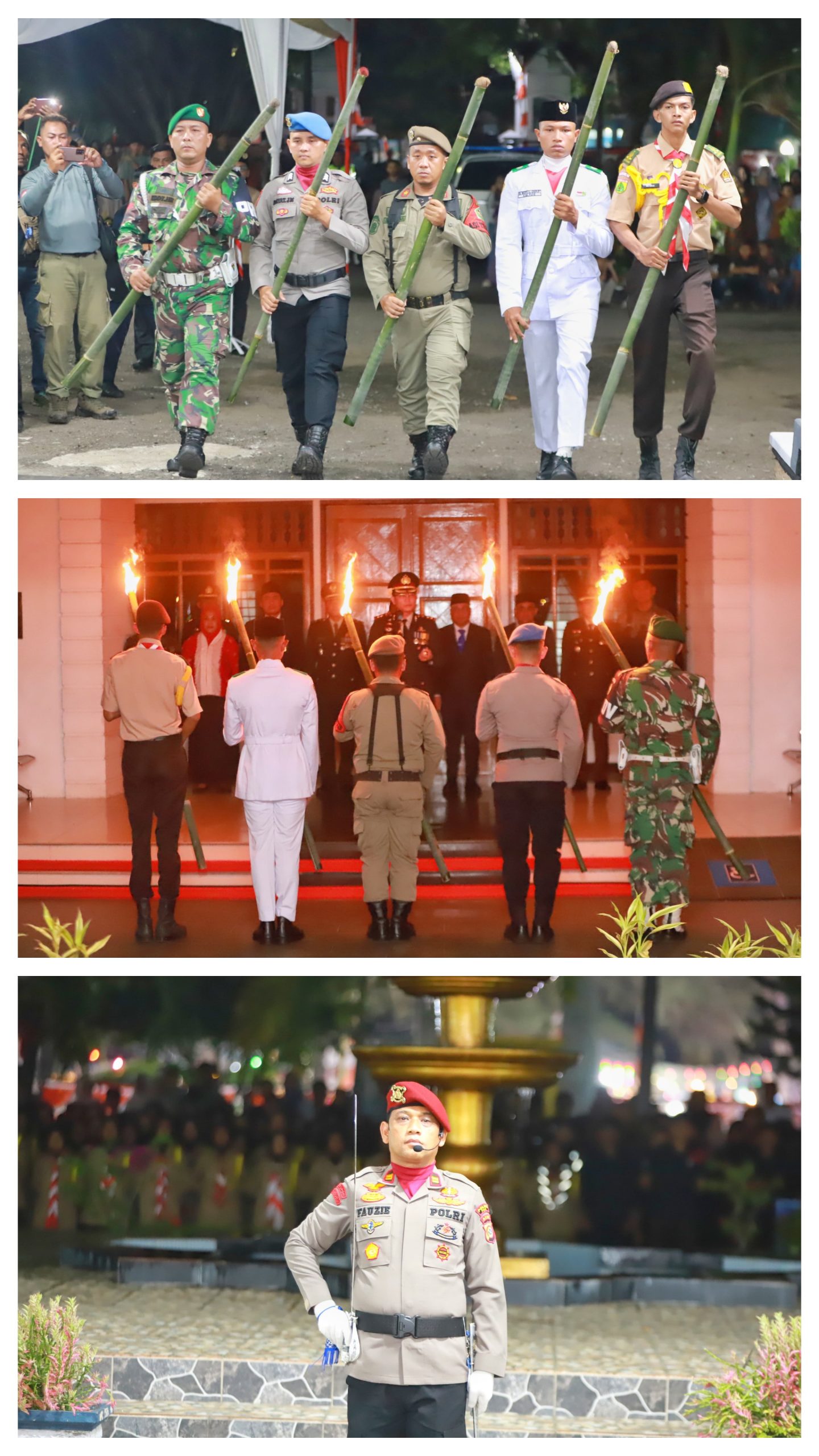 Penyalaan obor dilakukan oleh Inspektur Upacara kepada 5 perwakilan, yaitu dari anggota TNI, Polri, Satpol PP, Purna Paskibraka, dan anggota Pramuka.Selanjutnya penyalaan api obor diikuti oleh seluruh peserta.
